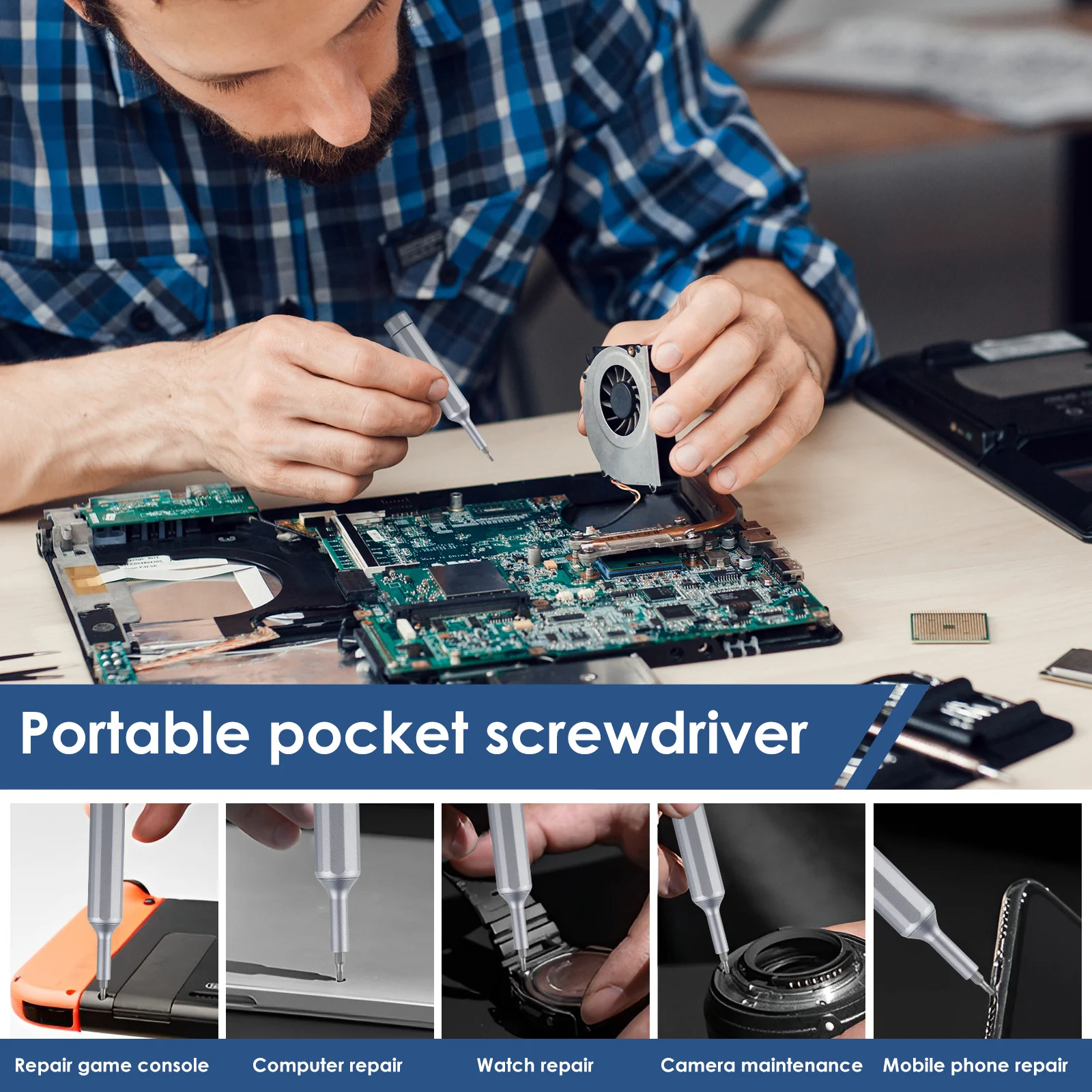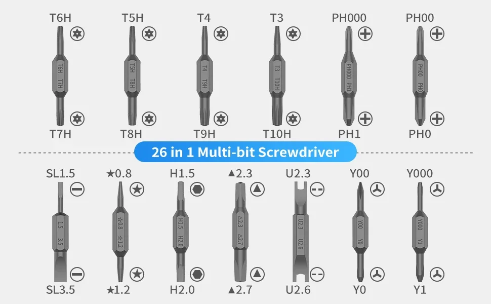 【39 in 1 Mini Screwdriver Set】Precision screwdriver set comes with a wide assortment of the most commonly, including Screwdriver Handle, Phillips (PH0000/PH000/ PH00/PH0/PH1/PH2), Slotted (SL1.5/SL3.5), Torx (T1/T2/T3/T4), Torx Security (T5H/T6H/T7H/T8H/T9H/T10H/T15H/T20H), Hex (H1.0/H1.3/H1.5/H2.0/H2.5/H3.0), Y-shaped (Y000/ Y00/Y0/Y1), U-shaped (U2.3/U2.6), Tri-Angle (2.3/2.7), Pentalobe (P2(0.8)/P5(1.2)), SIM card slot pin, MID screwdriver.